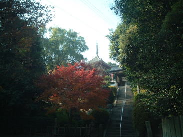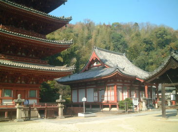 | 明王院 正門から石段を上がっていくと、五重塔(中央) と本堂がある。 |