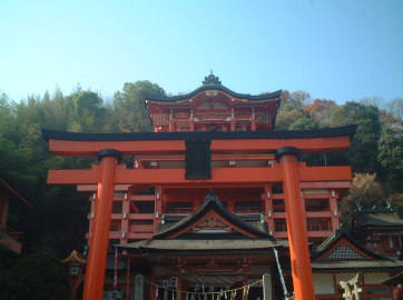 | 草戸稲荷 鳥居の上方に見えるのが本殿。地上から 高い位置にある珍しい神社。 |