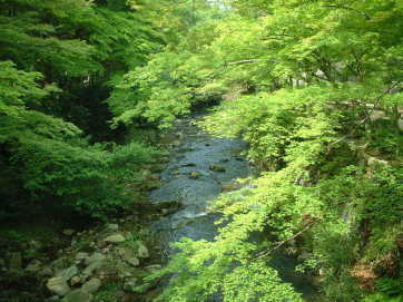 三原市 仏通寺 門前 仏通寺川。 光を受けて濃淡をつくる新緑が美しい。 |