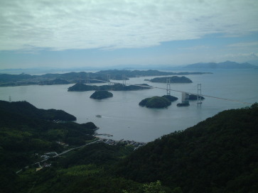 | 亀老山展望公園にて (大島) 展望台から来島海峡大橋(中央)と四国の 今治市(左側)と波方町(右側)を見たところ。 |