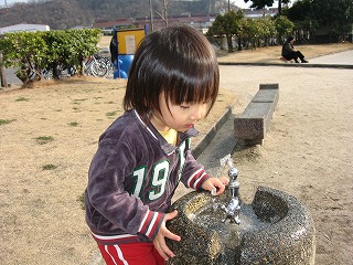 | 水飲みも初挑戦しましたが、顔と胸元は少し濡れました。 | ||