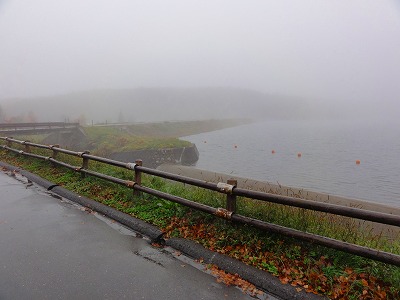左の写真のように雨霧で湖がほとんど見えなかった