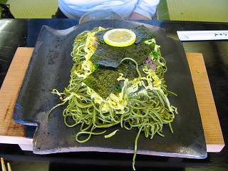 | 元祖瓦そば店「たかせ」で瓦そばを食べました。 焼けた茶そばがパリパリとして、とても美味でした。 |