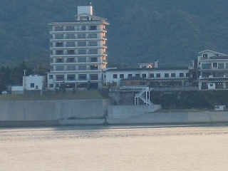 | 期待していた夕焼けにはなりませんでした。 | 宿泊の「楊貴館」を対岸からズーム撮影 | |